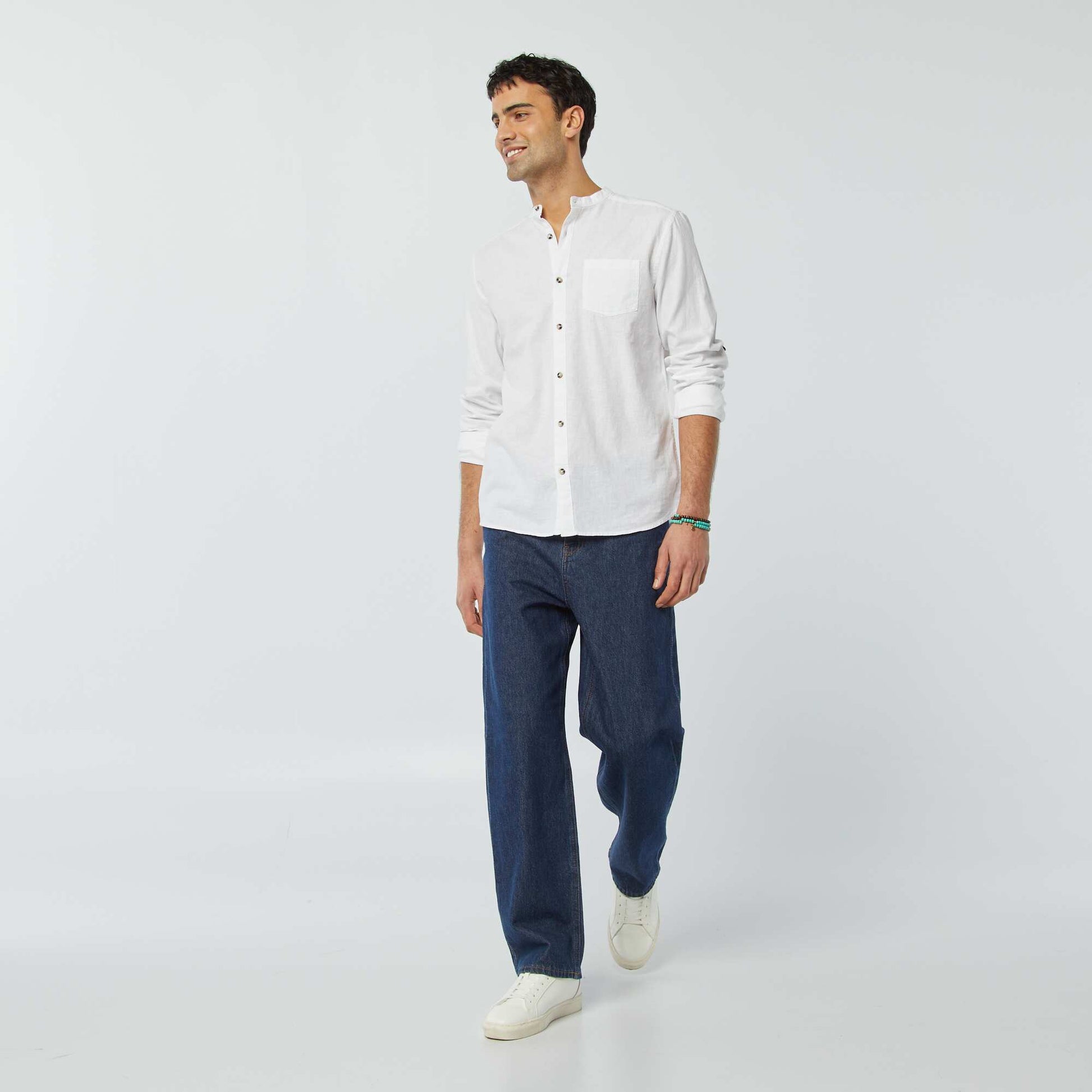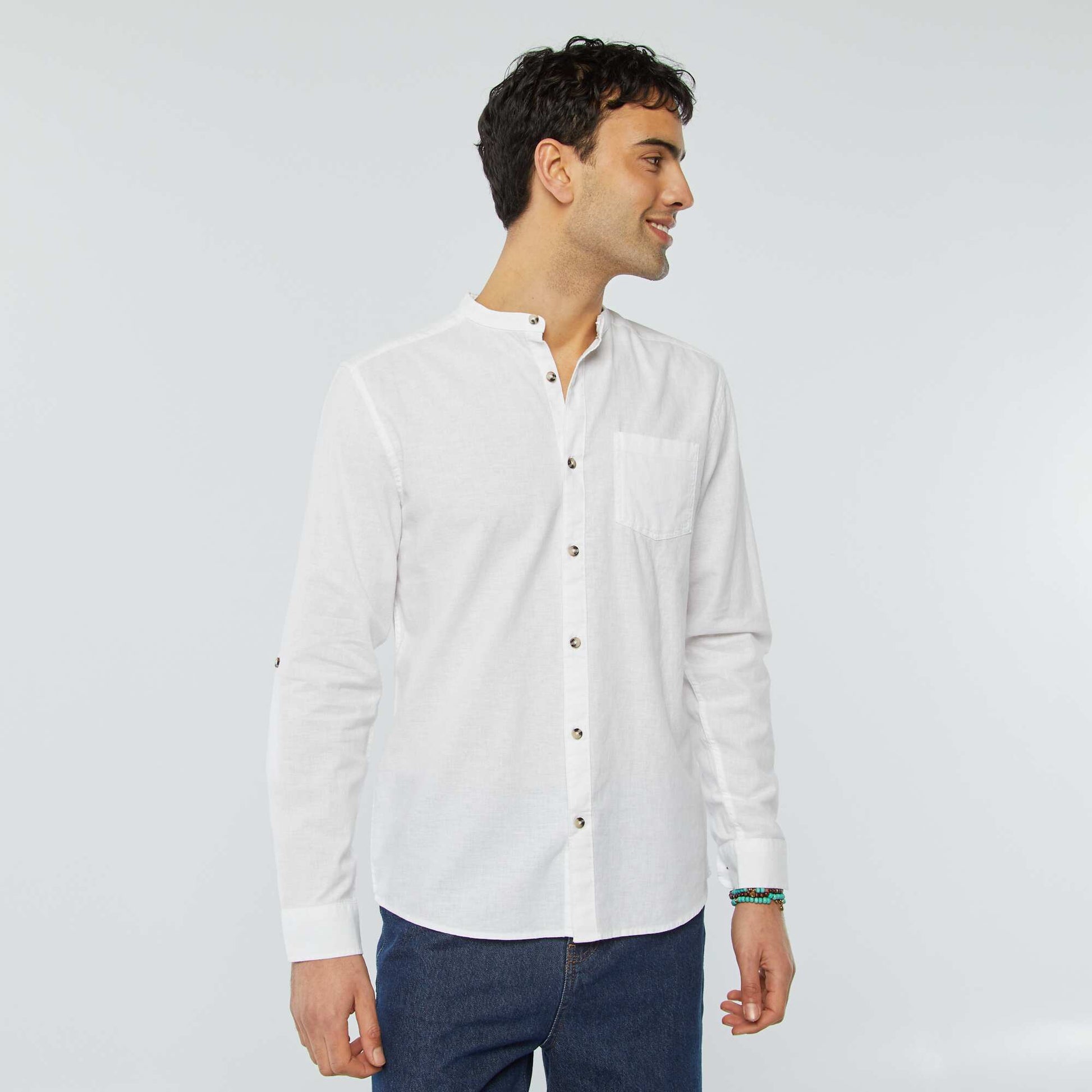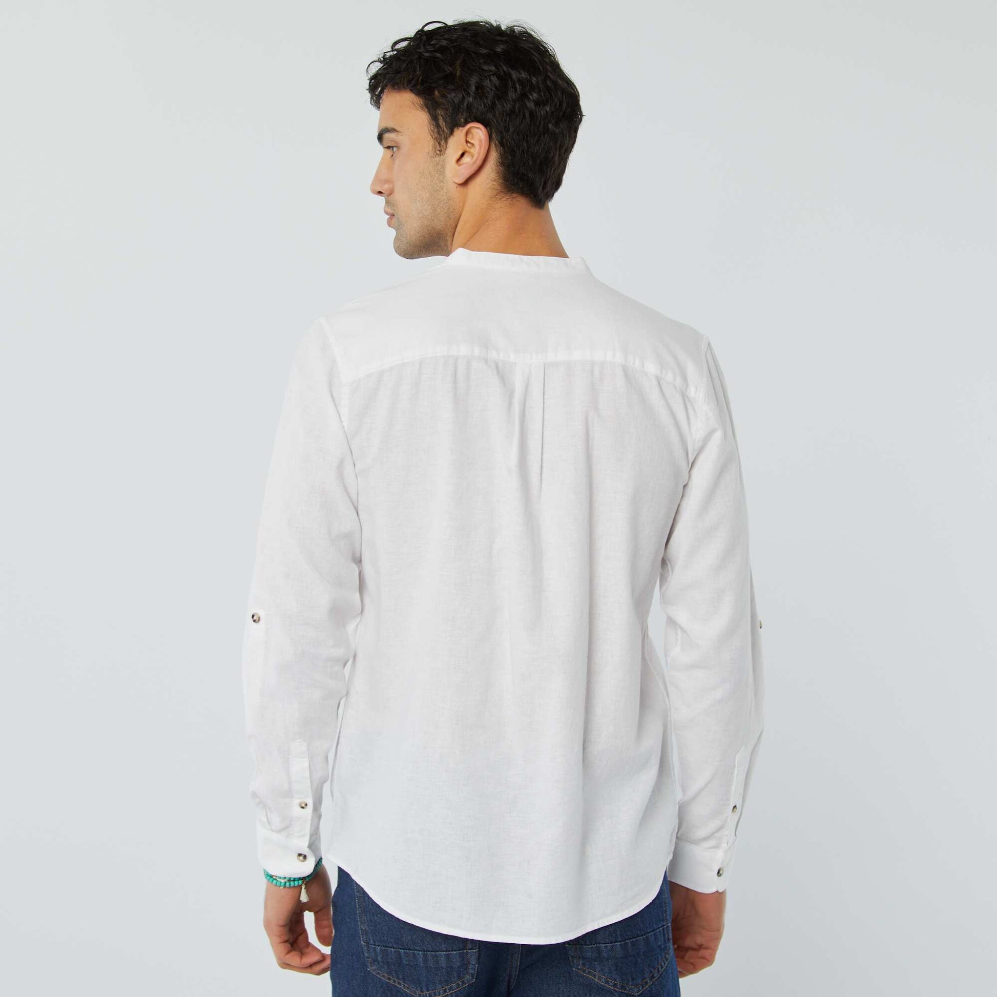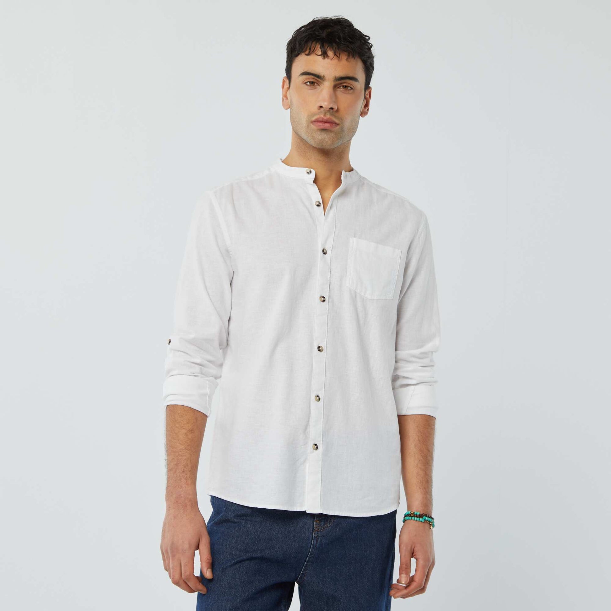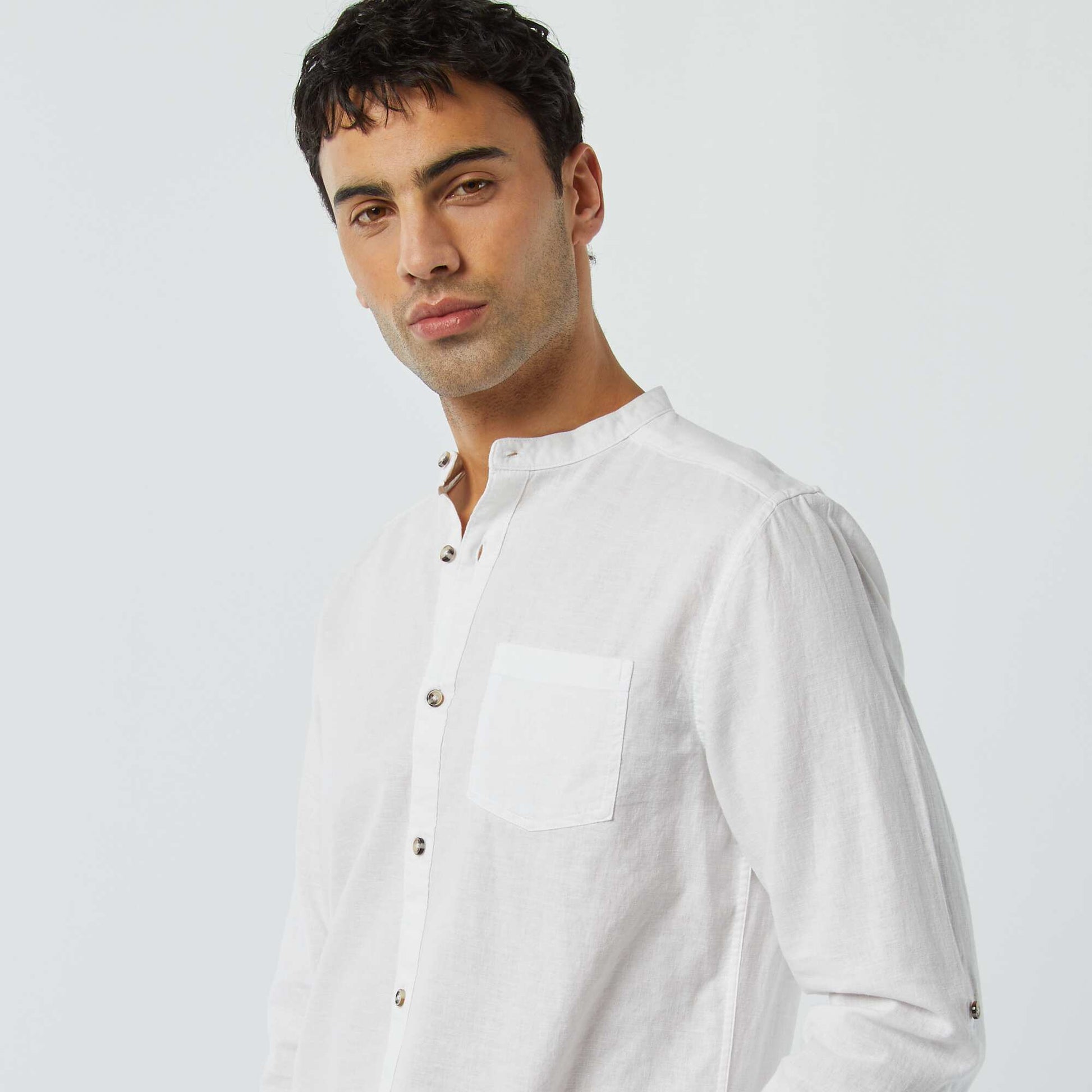 <p>A linen mandarin collar shirt for a preppy finish!</p><p>&nbsp;</p><p>- Plain shirt&nbsp;</p><p>- Linen and cotton&nbsp;</p><p>- Mandarin collar&nbsp;</p><p>- Long roll-up sleeves&nbsp;</p><p>- Button fastening&nbsp;</p><p>- 1 breast pocket&nbsp;</p><p>- Inverted pleat at the back&nbsp;</p><p>- Back length: approx. 75 cm&nbsp;</p><p>&nbsp;</p><p>- Model wears size M and measures 1m85&nbsp;</p><p><br>&nbsp;</p>