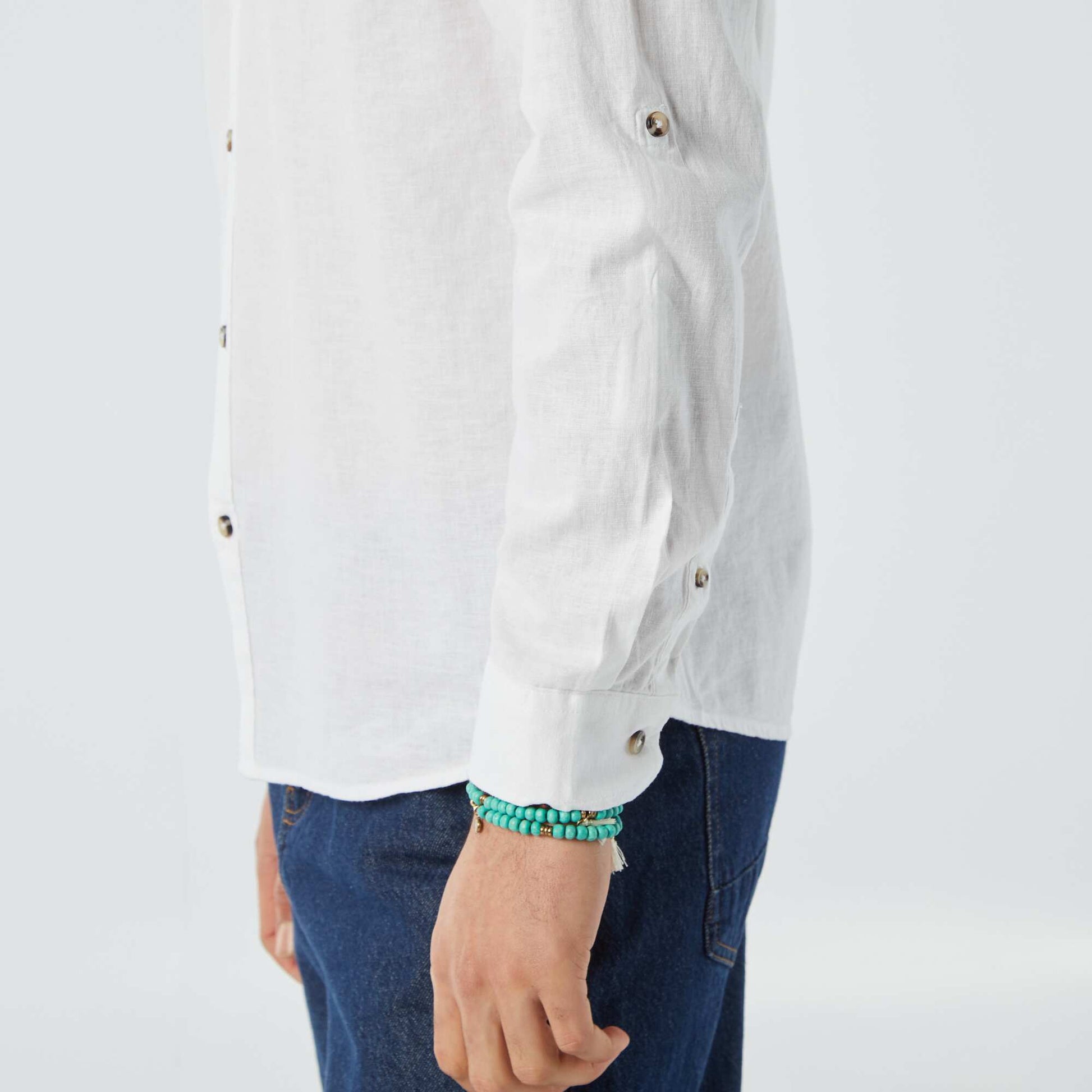 قميص بياقة الماندرين مع قميص من الكتان الأبيض